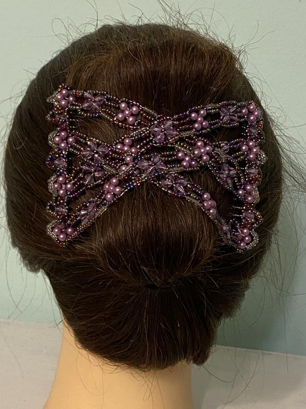 Две расчески соединенные нанизанными на резинку бусинами. Цвет расчесок - темный металл. Цвет бисера и бусин в основном сиреневого цвета с отливом.
