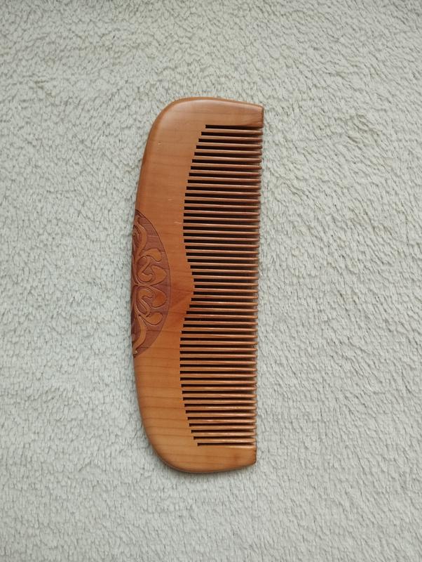деревянная расческа, вероятно, из персикового дерева (момо но кошки гуши), который является популярным в Японии. Материал: Изготовлен из натурального дерева, что делает его экологичным и бережным к волосам. Особенности: Часто имеет тонкую резьбу и гладкую поверхность, которая помогает предотвратить повреждение волос и кожи головы. Преимущества: Считается, что такие расчески способствуют здоровому росту волос и придают им блеск.