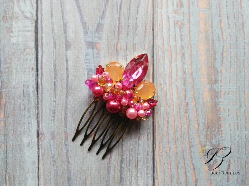 Расчески дополнят ваш образ на выпускных, праздничных событиях, придадут изысканности невесте. Цвет подбирается под цвет наряда. Основание изготовлено из металла (это добавляет расчески надежности и прочности) и имеет 5 зубцов. Украшение расчески выполнено из кристаллов и бусинок. Цвет: розовый с золотым. Цвет основания: золотистый Размер изделия (без зубцов): ширина 4 см., высота 3,8 см.