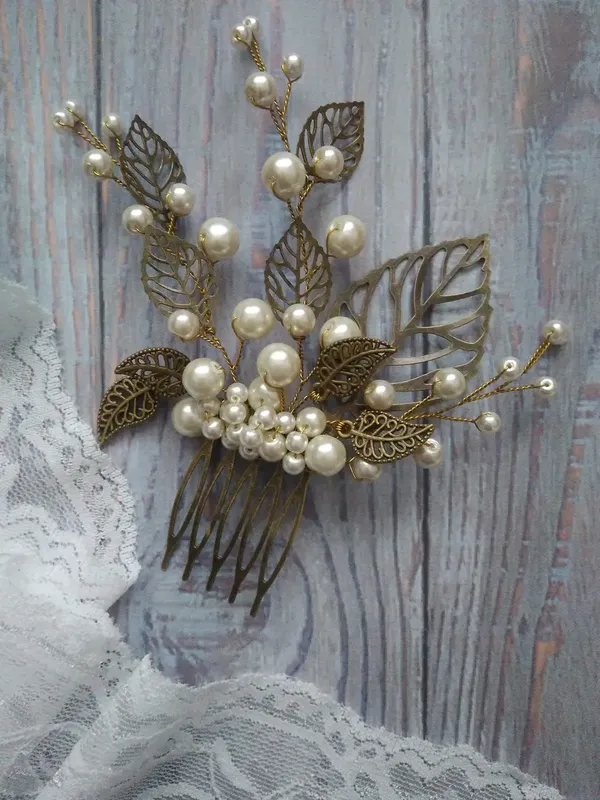 Расческа дополнит ваш образ на выпускных, праздничных событиях, добавит изысканности невестой. Основание изготовлено из металла (это добавляет расческе надежности и прочности) и имеет 5 зубцов. Украшение расчески выполнено из жемчужин и металлических листиков. Цвет: молочный. Цвет основы: золотистый. Размеры украшения (без зубцов): ширина 10 см., высота 7 см.