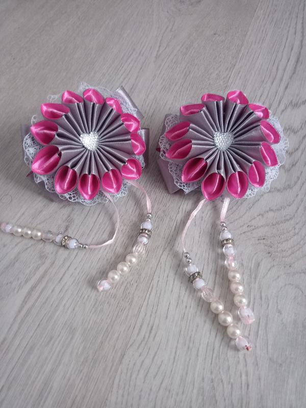 Бантики-зефірки з атласної стрічки та мережива. Діаметр 8 см, довжина підвіски 12 см. Ціна за пару.
