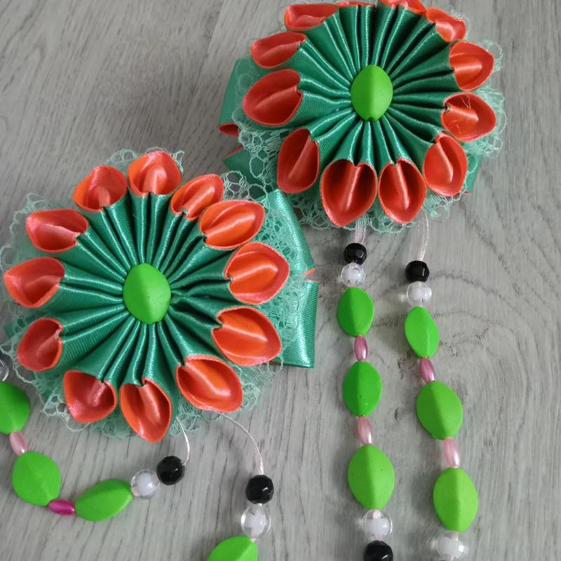 Бантики-зефирки из атласной ленты и кружева. Диаметр 8 см, длина подвески 12 см.