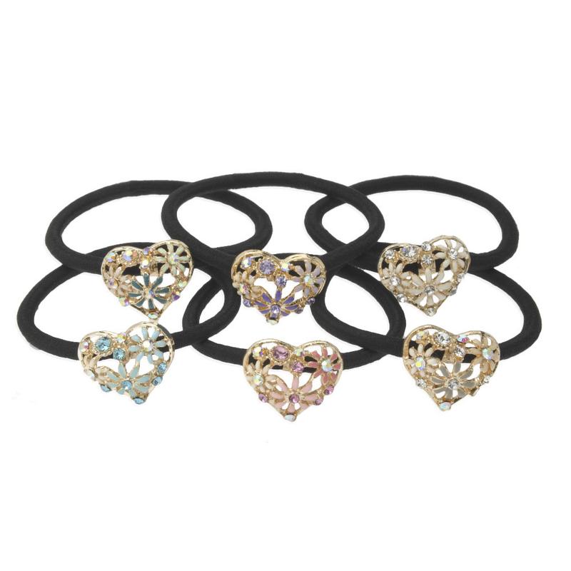 Резинка 9251 Резинка для волос представляет собой не только удобное приспособление для быстрого создания аккуратной прически, но и красивое украшение, которое подчеркнет изысканный вкус и утонченность девушки. Благодаря простому, но элегантному дизайну, изделие универсально — оно хорошо дополнит как повседневный образ, так и торжественный. Изготовлен атрибут из прочного и эластичного текстиля, мягкого на ощупь. При растягивании изделие быстро возвращается к исходным параметрам. Резинку можно очищать с помощью мыльного раствора, она мгновенно высыхает и не теряет первоначального внешнего вида. Гладкая поверхность легко и безболезненно снимается, не травмируя структуру волос и не запутывая их. Аксессуары позволяют аккуратно и надежно зафиксировать локоны любой длины, придают привычным повседневным укладкам изюминку. Атрибут представлен в черном цвете и декорирован ажурным сердцем золотистого цвета с добавлением цветов и стразов. Такое украшение будет смотреться празднично и женственно на волосах любого оттенка. Аксессуары представлены в разных цветах, что предоставляет возможность подобрать изделие, подходящее к наряду. Набор включает 6 предметов.