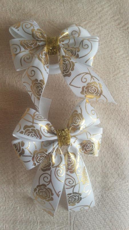 Бантики из репсовой ленты с золотым рисунком на резинке. Цена указана за 2шт.