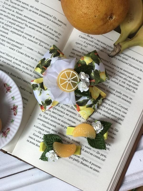 Набор мандаринки входит:бантик-ркзинка и заколочки. Бантик сделан из репсовлї ленты, размер 9х8 см. Украшен мандаринкой,цветком из ткани,бархатными листочками,розами. Заклки-крокодил, украшенные мандаринами,бархатным листьями, то розами.
