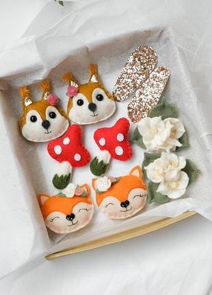 Красивые резинки и заколки ручной работы в хорошо подходят как на каждый день так и на праздник. • Цена за набор 8 резинок (лисички, мухомори, цветы, белочки) и 2 заколки клик-клак • Материал – фетр, эко-кожа (блестки не осыпаются) • Основа – резинки, заколки клик-клак --- Индивидуальный заказ ----- ♥ Можно приобрести изделия отдельно, изменить основу, заменить в украшениях цветовую гамму изделий (свои пожелания можно написать в комментариях к заказу или написать мне сообщение). шим сформировать подарочную коробку аксессуаров с учетом ваших пожеланий. ♥Я выполняю индивидуальные заказы. Если у вас есть вопросы или вы хотите что-то изменить в украшении, просто пишите о своем желании в комментариях к заказу или созвучьте со мной для обсуждения деталей. Подберем именно то, что вам нужно:-) ♥Если украшение вам нужно срочно или к конкретной дате, пожалуйста, сообщите мне об этом. Я могу сделать все возможное, чтобы вы получили заказ в кратчайшие сроки ____________________________________ * Цвета могут немного отличаться из-за различных настроек и цвета экранов * Смотрите больше работ в своем магазине, добавляйте работу до выбранного Товар изготавливается по заказу