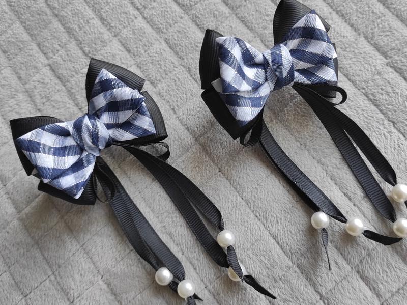 Пишні чорно-білі бантики з люрексом та стрічками що звисають. На кінчиках стрічок перламутрові біді перлинки Ціна 130 грн за 2 штуки Розмір бантика 6,5х5 см. Довжина стрічечок що звисають 9 і 10 см. Основа - резинка діаметром 3,5 см
