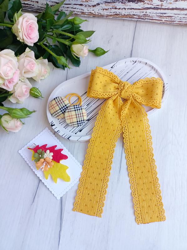 - большой бант из микровельвета, длина хвостиков 18 см, ширина 11 см, крепление заколка-качетка - заколка дубовый лист - гудзики-резиночки