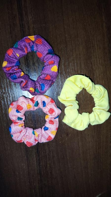 Розовая и желтая были в использовании раз (диаметр в нерастянутом виде - 3.5 см). Фиолетовая была в использовании - растягивалась чуточку (диаметр - 4 см). Тканевые резинки. Ткань напоминает полиэстер. Продаются все вместе.