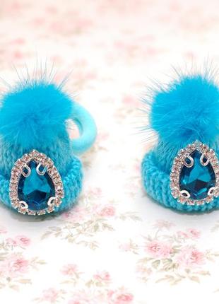 Модные милые шапочки на резиночках выполнены в бирюзовом цвете. Декорированы стразовым декором (пришит) и натуральным пушком. Основа - резинки. Цена указана за пару
