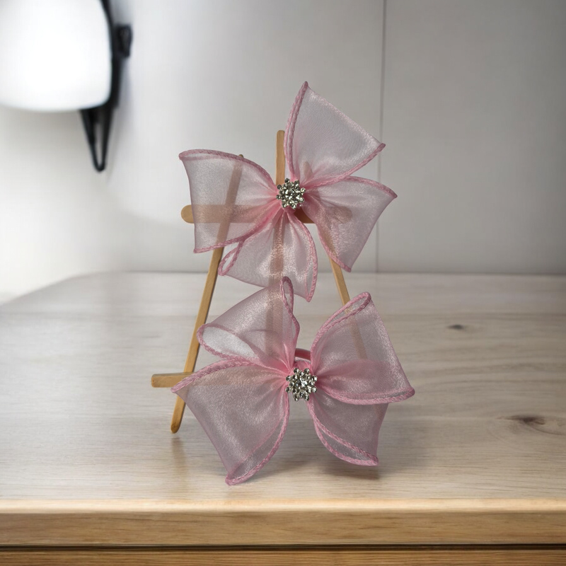 Нежные розовые бантики из органзы на резинках ✨ Легкие, воздушные и очень праздничные – идеально дополнят прическу для садика, праздника или фотосессии. Среда со стразами придает особый блеск.