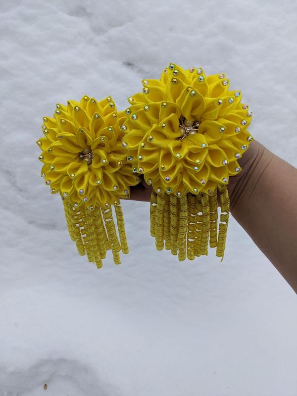 Это желтые резиночки и заколочки для волос ручной работы, выполненные в технике канзаши из атласных лент. Каждое украшение выполнено в виде многослойного цветка (похожей на жестяную или лилию), украшенной многочисленными стразами, имитирующими капли росы. Характерной особенностью данной модели являются длинные подвески из закрученных лент, которые часто называют "кучерями" или "спиралками". Диаметр цветка 9 см