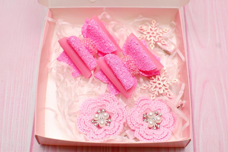 Набір прикрас виконаний у рожевому кольорі. Чудовий подарунок на день св. Миколая, Новий Рік та Різдво. Набір складається: 1. бантики з екошкіри (основа - резинки) розміром 7,5*6 см 2. заколки з в*язаними квітами розміром 5 см 3. заколки-сніжинки 4 см. Всі прикраси упаковані у святкову коробочку розміром 15*15*3 см.