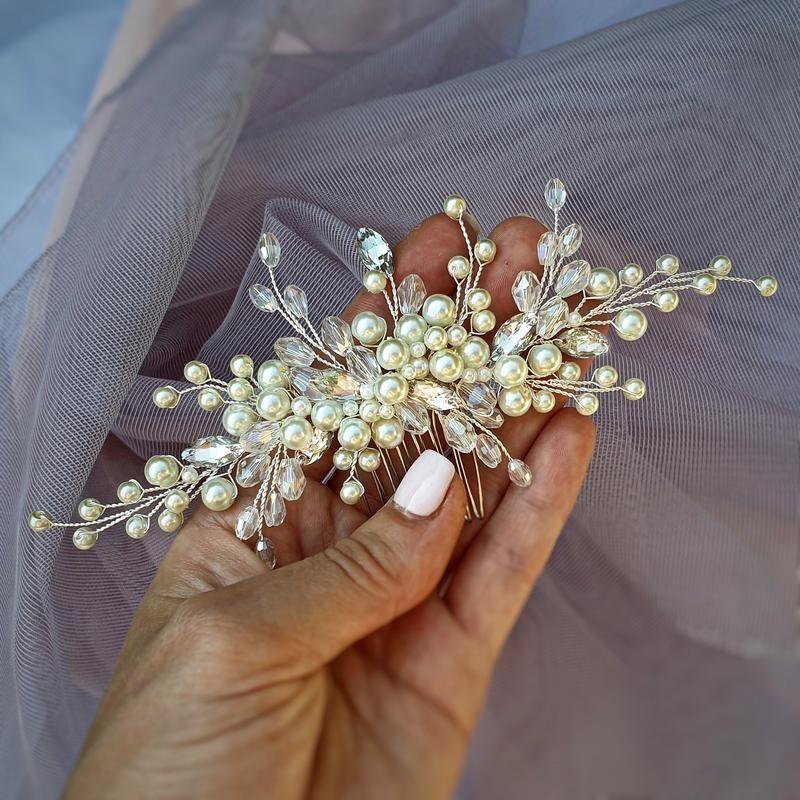 Гребешок для прически, изготовлен из хрустальных и жемчужных бусин,посеребренной проволоки. Изделие гибкое, принимает любую форму. Возможно изготовление в других цветах. Ручная работа. Длина украшения 15 см. ВНИМАНИЕ! Наложенным платежом отправляю по предоплате 100грн. Дополнительные характеристики: Цвет : Бежевый Цвет : Серебристый Материал : Бусины Материал : Искусственный жемчуг Материал : Камни Тип: Гребень