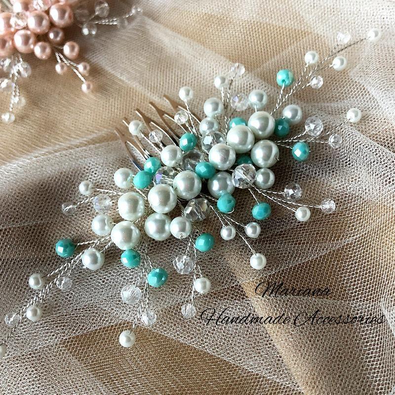 Гребінець в зачіску сплетений посрібленим дротиком з хрустальних прозорих і мятних бусин, жемчужні бусини білі. ((Світліших м‘ятних бусин немає, є темніші) Довжина плетіння 15см. На замовлення мятні бусини можна замінити на бусини іншого кольору. Товар под заказ