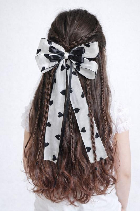 Бант из прозрачной органзы с нежным принтом сердечек 🤍 Аккуратные петли, длинные ленты и контрастная черная атласная лента добавляют выразительности. Стильный акцент для прически, который подходит и на каждый день, и для особых моментов