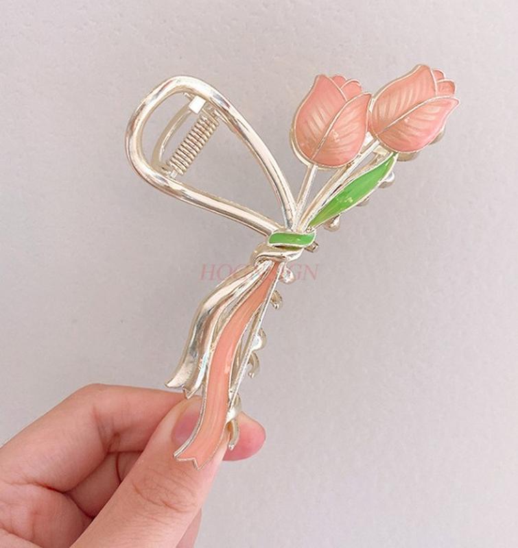 Крабик металлический с цветком тюльпана. Модное украшение для волос. Длина 10,5 см, цвет персиковый.