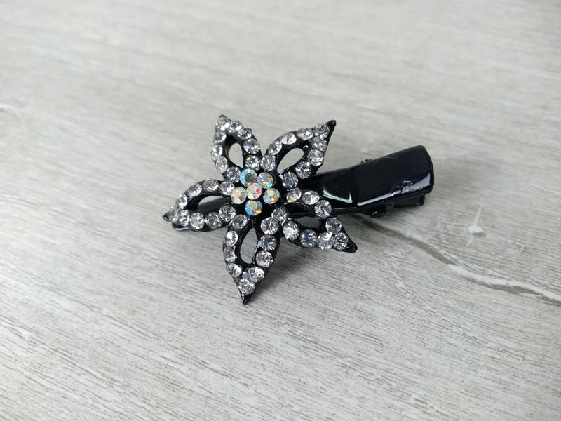 Металічна заколка на волосся з камінчиками квіточка (арт. 5261). Зажим. Довжина заколки 4 см. Розмір квіточки 2,8 см х 2,8 см.