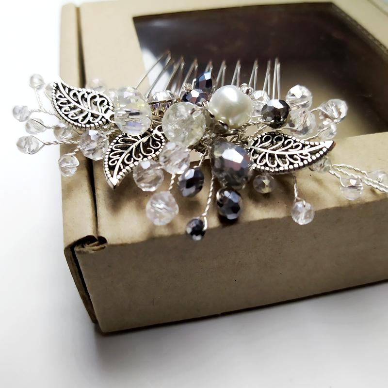 Гребень ручной работы В работе: ювелирная посеребренной проволока, хрустальные бусины, металлические листочки. В наличии очень много украшений, если не нашли нужного- обращайтесь. Подберу или сделаю под заказ в короткие сроки.