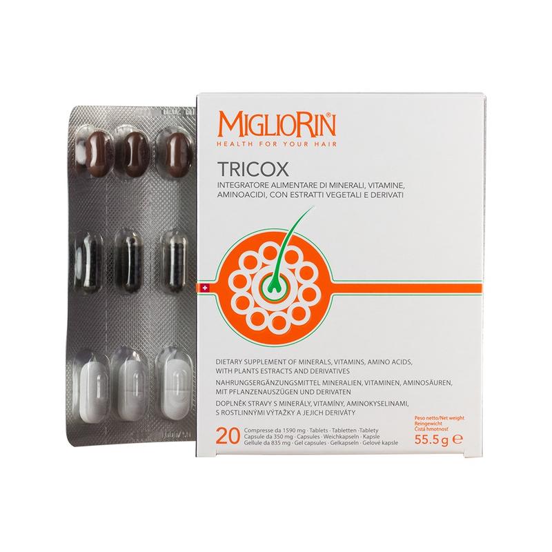 Найбільш частою причиною, що викликає випадання волосся, є порушення гормонального фону. Ріст волосся відбувається завдяки особливому гормону – дегідротестостерона. У разі, якщо його виробляється більше, ніж потрібно, волосяні фолікули піддаються надто інтенсивної стимуляції, що призводить до уповільнення росту волосся, а потім і зовсім, до зупинки росту волосся. kapsuly dlya rosta volos trikoks ot migliorin stoimost ot 2300 rub 455x600 Перетворення тестостерону в дигідротестостерон відбувається завдяки ферменту 5 альфа редуктази. І якщо скоротити дію цього ферменту, то дегидротестостерона стане вироблятися менше, і випадання волосся зупиниться. Фітопрепарат Миглиорин трікокс містить всі необхідні вітаміни і активні компоненти з олії сої, олії зародків пшениці, екстракт польового хвоща, і екстракт проса, – для швидкого і ефективного зупинення випадіння волосся, завдяки зниженню 5 альфа редуктази. У блістері міститься таблетка для прийому після сніданку, желатинова капсула (приймати після обіду) і капсула (приймати після вечері). Кожна з речовин, яка знаходиться в трікокс краще засвоюється в організмі в певний час доби. Тому важливо дотримуватися правила прийому. Активні компоненти діють в синергії: покращують живлення тканин, зміцнюють коріння і заспокоюють шкіру голови, покращують периферичний кровообіг, відновлюють цибулину волосся. Подовжують фазу анагена (період активного росту) волосся. Рекомендується приймати для стимулювання росту волосся або при сильному випаданні волосся. Капсули від випадіння волосся рекомендуються при гніздовій і андрогенетичнії алопеції, сезонному випаданні волосся, при ослаблених волоссі, себореї, в післяпологовий період, для відновлення волосся після хіміотерапії.