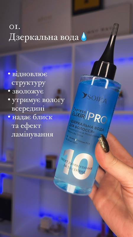 Ультра сияющие волосы с эффектом ламинирования за 10 секунд от SOIKA Продукт предназначен для ухода за окрашенными и натуральными волосами. Компоненты средства восстанавливают, увлажняют и питают волосы, придают им бриллиантовый блеск. Эликсир мгновенно попадает и встраивается в структуру волос, создавая безусловную гладкость и сияние без утяжеления волос. Средство содержит уникальную композицию ингредиентов, которые являются функциональными для волос. Express Elixir PRO для волос реконструкция и увлажнения Hydrolyzed keratin – восстанавливает структуру волос, защищает от воздействия окружающей среды и придает упругость и эластичность. Hydrolyzed Silk – регенерирует ослабленные и поврежденные волосы, удерживает влагу на поверхности, придает волосам блеск, эластичность и ощущение шелковистости. Chitosan PCA – увлажняет, кондиционирует и защищает волосы, придает блеск и сохраняет цвет волос.