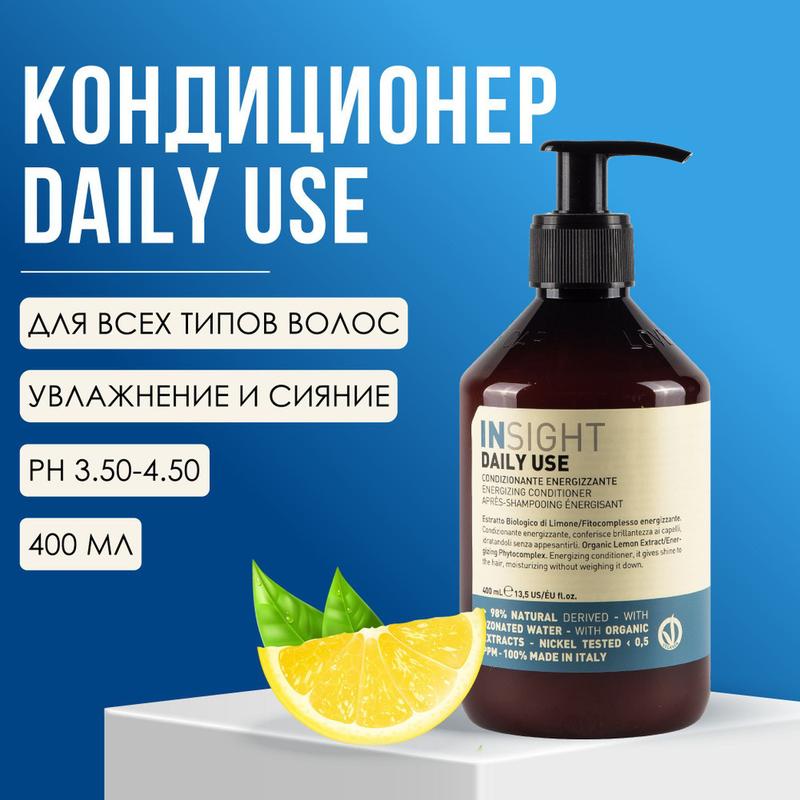 Insight Daily Use Energizing Conditioner (для щоденного догляду) 400 мл - кондиціонер для щоденного догляду за всіма типами волосся від італійського бренду. Формула засобу, насичена органічними маслами абрикоса, соняшнику і зародків кукурудзи разом з рослинними екстрактами надає кондиціонеру зволожуючі і живлять властивості. Використання продукту наситить волосся вітамінами і мікроелементами, додасть їм м'якість і слухняність, полегшить розчісування. Обсяг 400 мл. СПОСІБ ЗАСТОСУВАННЯ Кондиціонер Insight Daily Use Energizing Conditioner нанести на чисте вологе волосся, рівномірно розподілити по волоссю. Залишити на 3-5 хвилин, потім ретельно змити теплою водою.