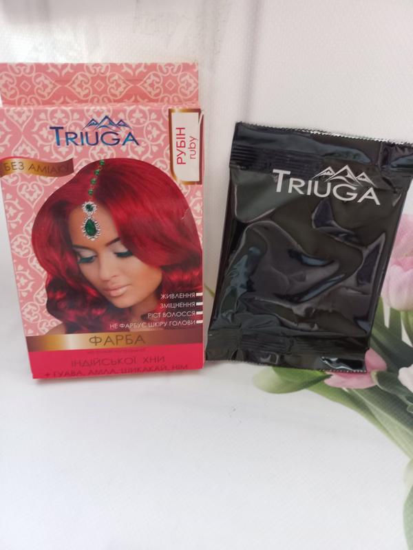 Фарба на основі натуральної хни — колір РУБІН Природна фарба для волосся на основі хни надає стійкого кольору вашему волоссю, діє як натуральний кондиціонер. Завдяки додаванню індійських рослин таких як: шикакай, порошок німу і амли, фенугреку - фарба відновлює волосся, живить корені, укріплює по всій довжині, зупиняє випадіння волосся і стимулює їх ріст, усуває лупу. Надає об'єм та блиск. Не використовувати для фарбування брів і вій. Інструкція з використання: 1. Змішати 30 мл теплої води з 10 г фарби для волосся в пластиковій мисці. Використовуйте шпатель для отримання пасти. 2. Нанесіть пасту на волосся, використовуючи щіточку для легкого і ефективного нанесення фарби. Залиште фарбу протягом 30-60 хвилин, в залежності від бажаної насиченості кольору, після чого ретельно змийте. Для того, щоб надати волоссю аромат і м'якість, після фарбування, використовуйте олію для волосся. 3. Помийте волосся шампунем для отримання насиченого кольору і блиску. Використовуйте рукавички, щоб уникнути фарбування рук і одягу. Використовуйте повний вміст мішечку для одноразового використання, і не зберігайте залишків. У разі попадання фарби в очі негайно промити чистою холодною водою. Відправочка укр та новою поштою 134