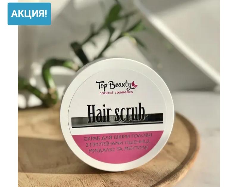 Скраб-пилинг для кожи головы украинского производителя Top beautu. Свойства: улучшает кровообращение и питание волосяных луковиц. предотвращает возникновение перхоти и зуда пробуждает дремячи луковицы и стимулирует рост волос. Состав: кости абрикоса,кератин,ментоловые масла. Также имею другую продукцию Top beautu,