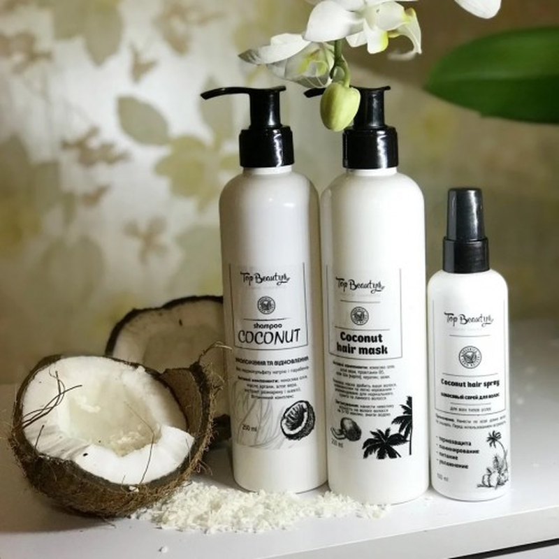 Маска: живильна інтенсивна маска підійде для любителів ніжного кокосового аромату. На основі олії ядра кокосової пальми, містить білки пшениці і пантенол, зробить Ваше волосся блискучим, шовковистим. Рекомендується для сухого та пошкодженого волосся