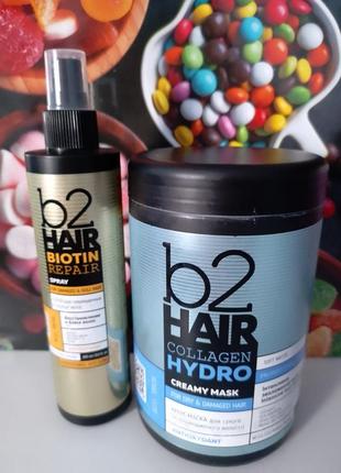 Спрей B2 Hair Biotin Repair для тусклых и поврежденных волос 250 мл Формула спрея для тусклых и поврежденных волос бренда b2 Hair разработана на основе биотина, пептидов шелка, киноа, витаминов Е и А, поэтому отличается эффективностью. Средство дарит прядям мягкость и здоровое сияние, притом без эффекта утяжеления и склеивания. Косметический продукт интенсивно увлажняет, питает и восстанавливает, предотвращает проблемы истончения и спутывания, защищает волосы от механических повреждений, сводит к минимуму воздействие внешних факторов, способствует легкому расчесыванию и укладке. Также спрей защищает от разрушительного воздействия высоких температур при использовании термоприборов, которые провоцируют термические повреждения. Крем-маска для сухих и поврежденных волос бренда b2Hair разработана на основе высокой концентрации увлажняющих и питательных компонентов – коллагена, пептидов шелка, масел оливы и кокоса, моной де Таити. Это hair-коктейль для естественной красоты и здоровья прядей. Средство станет отличным дополнением регулярного ухода за прядями, которые перенесли в результате частого окрашивания и горячей укладки, поскольку позволяет избавиться от нескольких проблем. Маска избавит волосы от ломкости и сухости, обеспечит глубокое питание и увлажнение, насытит витаминами и микроэлементами, которые способствуют восстановлению и оздоровлению прядей.