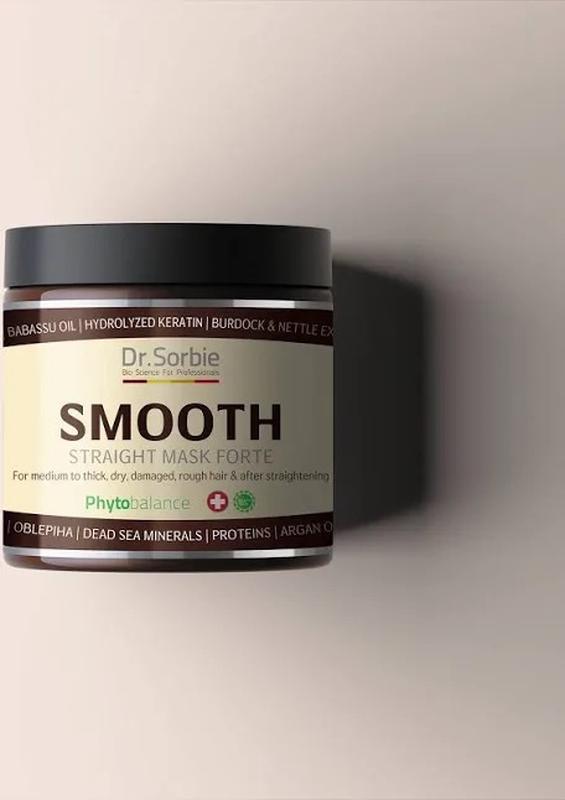 Smooth Straight Mask Forte Dr.Sorbie це терапевтична розгладжуюча маска для натурального сухого, пошкодженого, пористого, жорсткого або кучерявого волосся. Рекомендована для зволоження, відновлення гладкої структури волосся, яке було пошкоджене в результаті частого використання гарячих укладок, хімічного випрямлення, освітлення чи фарбування. Ефект – після першого застосування.