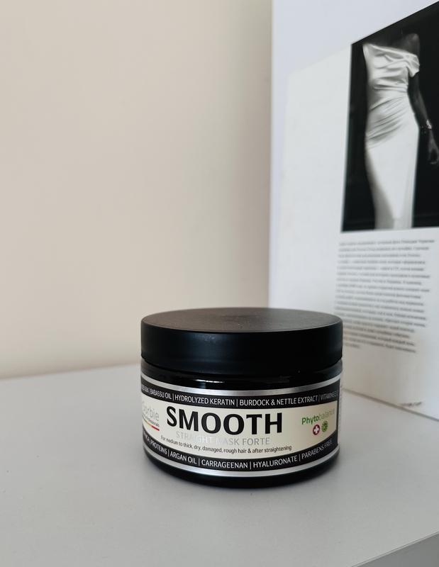 Smooth straight mask forte Терапевтична розгладжуюча маска для натурального кучерявого, сухого, пошкодженого, пористого жорсткого, волосся після хімічних випрямлень Ключові активні інгредієнти: • Екстракт лопуха • Екстракт кропиви • Гідролізований пшеничний протеїн • Екстракт ірландських червоних водоростей • Гідролізований соєвий протеїн • Гідролізований кератин • Вітамін В5 • Екстракт листя арганії • Гідролізований овочевий протеїн • Шовк • Масло кокоса • Вітамін С • Масло бабассу • Масло Аргана • Масло обліпихи
