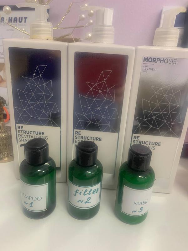 Експрес-філер RE-STRUCTURE – це ексклюзивна салонна послуга з інтенсивного відновлення волосся від науково-дослідної лабораторії FRAMESI. Призначена для сухого волосся, для волосся, яке погано розчісується, для тонкого, неживого, а також того, яким вже не допомагає звичайний догляд. Якщо волосся дійсно пошкоджене, то воно потребує глибокого відновлення, і єдиний спосіб зробити це - використання особливої концентрації активних інгредієнтів, які, як цеглинки, будуть заповнювати структуру волосся, глибоко і швидко відновлюючи його структуру. Ключові активні інгредієнти: гіалуронова кислота, морський колаген, силіконовий полімер нового покоління. Ексклюзивний аромат продуктів цієї серії Prada By Prada Продається на розлив з великого обьему 3*100 мл . Цього вистачить на 3 -5 раз , як що у вас довжина волосся до плеч. На 2 -3рази , як що до лопаток