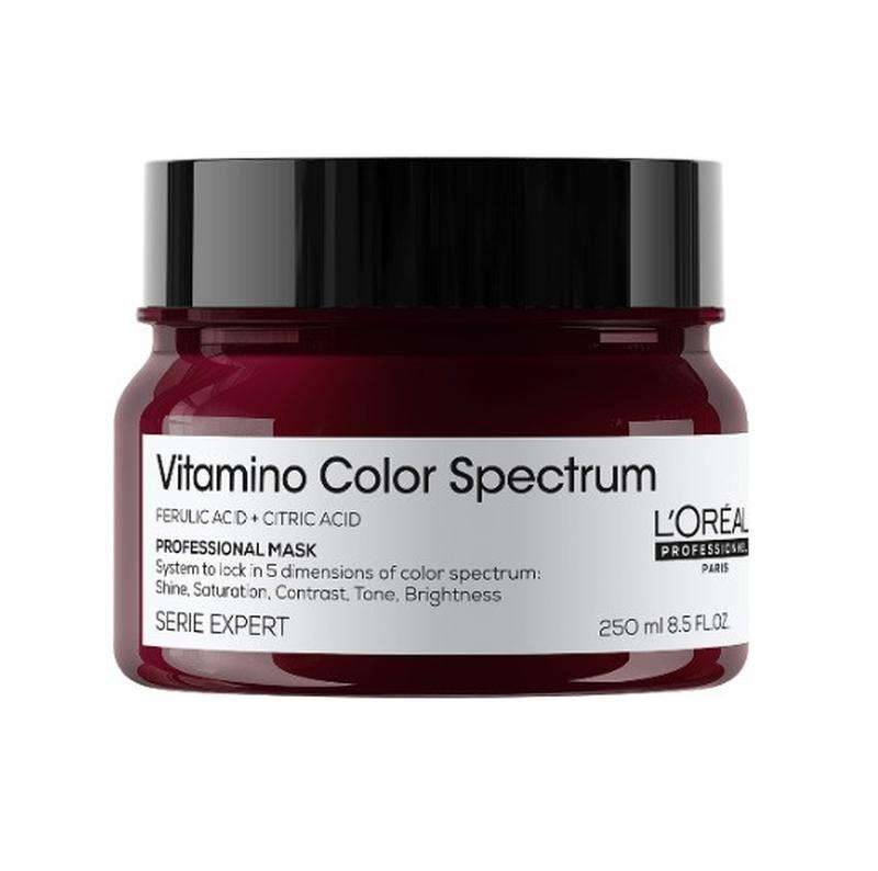 Маска для сияющего блеска и сохранение 5 измерений цвета L'Oreal Professionnel Vitamino Color Spectrum Mask, 250 мл L'Oreal Vitamino Color Spectrum Mask -- это профессиональная маска для окрашенных волос, обеспечивающая интенсивный уход, зеркальный блеск и сохранение насыщенности цвета. Обогащенная феруловой и лимонной кислотами, она запечатывает цветовые пигменты внутри волосяного волокна, предотвращая их вымывание и продлевая стойкость окрашивания. 5 измерений цветового спектра: ✔ Блеск - дарит волосам эффект зеркального сияния ✔ Яркость - сохраняет насыщенность и глубину оттенка ✔ Контраст - подчеркивает различие между оттенками ✔ Тон - предотвращает появление нежелательных рефлексов ✔ Глубина цвета - поддерживает баланс светлых и темных оттенков Результат: ✅ До 44% более гладкие волосы ✅ Мгновенный эффект зеркального блеска ✅ Более стойкий и насыщенный цвет Богатая кремовая текстура маски делает ее идеальной для ухода за густыми и окрашенными волосами, интенсивно питая их без утяжеления. Способ применения: после мытья головы шампунем разделите влажные волосы на две части. Нанесите маску равномерно по длине и кончикам, распределяя пальцами. Оставьте на 3-5 минут, затем тщательно смойте. Для максимального эффекта завершите уход нанесением Vitamino Color Spectrum Glass Shine Serum.