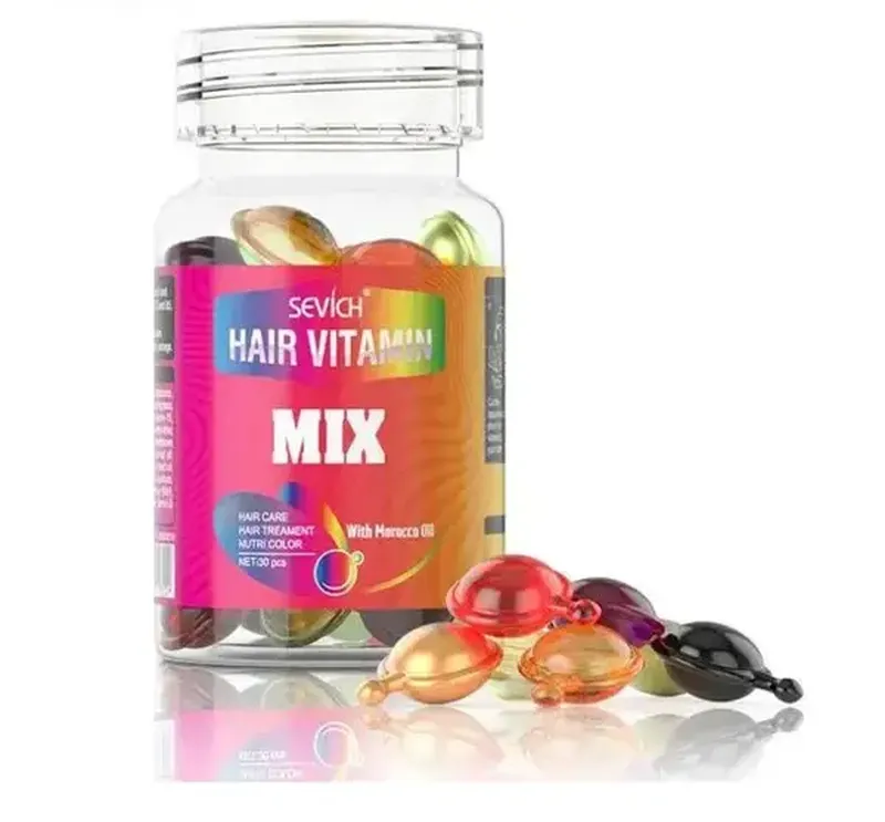 Преимущества: Легко впитывается в структуру волос; Восстанавливает поврежденные участки волос; Легкое расчесывание без электризации; Делает волосы послушными и шелковистыми; Питает и восстанавливает; Есть результат уже от 1 применения. В капсулах для волос Sevich Hair Vitamin Mix вас ждет настоящее сокровище – арсенал для интенсивного ухода за вашими волосами, предлагающий не только результаты, но и выбор. Каждая из семи разноцветных капсул – это как отдельный ключ к замку ваших волосных проблем. С Sevich Hair Vitamin Mix у вас есть возможность создать свой собственный рецепт красоты для ваших волос, который будет точно соответствовать их уникальным потребностям. Способ применения: Вымыть волосы и немного подсушить полотенцем. Отрезать носик капсулы. половину масла распределить по ладоням. Нанести масло на влажные волосы для термозащиты и увлажнения. Высушить волосы. Остатки масла нанести на сухие волосы. Золотые- Витамины для питания и блеска волос с марокканским маслом и алоэ вера. Предназначены для ухода за сухими, тусклыми и нормальными волосами. Помогают сохранить волосы гладкими и блестящими. Индонезийская марокканская масло, масло жожоба, а также витамины А, С, Е, В-5 сделают ваши волосы ухоженными, увлажненными и подарят ощущение мягкости и блеска. Фиолетовые Витамины на основе марокканского масла для питания и защиты окрашенных волос. После использования волосы становятся мягкими, легко расчесываются, а цвет держится дольше. Оранжевые- Витамины с марокканским маслом, женьшенем, экстрактом меда, витаминами А, С, Е, и Pro Vit B5 для ломких и пористых волос питают, защищают и ухаживают за ними. После использования волосы выглядят более здоровыми, блестящими и послушными. Черные- Витамины в составе имеют масло лесного ореха, алоэ вера и витамины А, С, Е, Provitamin B5 питают, увлажняют, защищают от УФ-излучения, придают блеск, делают волосы послушными, гладкими и крепкими. Зеленые- Витамины для секущихся сухих кончиков. В составе содержат марокканское масло, масло семян камелии, витамины А, С, Е, Provitamin B5. Подходят для окрашенных волос, отлично увлажняют и придают шелковистый вид. Красные Витамины для глубокого обновления волос. В составе содержат марокканское масло, масло жожоба, витамины А, С, Е, Provitamin B5. Питают и восстанавливают ломкие жесткие волосы. Волосы становятся более здоровыми, сильными, гладкими и мягкими, как шелк. Желтые- Витамины содержат марокканское масло, алоэ вера, витамины А, С, Е, Provitamin B5. Смягчает волосы, питает их и сохраняют влагу. Волосы становятся более здоровыми, блестящими и послушными.