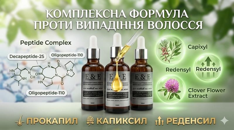 Засіб проти випадіння волосся в тому числі проти андрогенетичного випадіння ! В складі прокапіл, капиксіл, амінокислоти; пептиди, карлікова пальма, кофеін, кетиконазол, вітаміни, екстракти