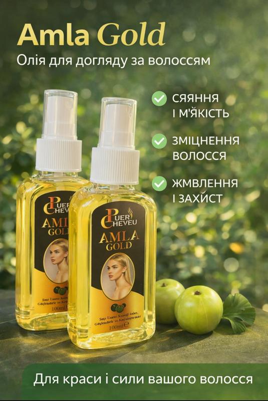 Олія для волосся Amla Gold використовується для зміцнення, живлення, пом'якшення, надання блиску та стимуляції росту волосся, а також для запобігання випадінню та передчасному посивінню. Вона містить екстракт амли, мигдалю та хни, які в комплексі покращують стан волосся та шкіри голови. Амла (індійський агрус) багата на вітамін С, який зміцнює коріння волосся та запобігає його випадінню. Олія призначена для зміцнення, живлення та зволоження волосся, особливо підходить для слабкого, січеного, пошкодженого хімічною завивкою або фарбуванням волосся. Рекомендується втирати у шкіру голови, залишати на деякий час (краще на ніч) і потім змивати шампунем. Можна також додавати кілька крапель у шампунь.