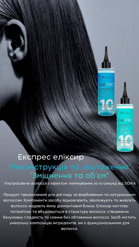 Ультра сияющие волосы с эффектом ламинирования за 10 секунд от SOIKA. Продукт предназначен для ухода за окрашенными и натуральными волосами. Компоненты средства восстанавливают, увлажняют и питают волосы, придают им бриллиантовый блеск. Эликсир мгновенно попадает и встраивается в структуру волос, создавая безусловную гладкость и сияние без утяжеления волос. Средство содержит уникальную композицию ингредиентов, которые являются функциональными для волос. Express Elixir PRO для волос реконструкция и увлажнения. Hydrolyzed keratin – восстанавливает структуру волос, защищает от воздействия окружающей среды и придает упругость и эластичность. Hydrolyzed Silk – регенерирует ослабленные и поврежденные волосы, удерживает влагу на поверхности, придает волосам блеск, эластичность и ощущение шелковистости. Chitosan PCA – увлажняет, кондиционирует и защищает волосы, придает блеск и сохраняет цвет волос.