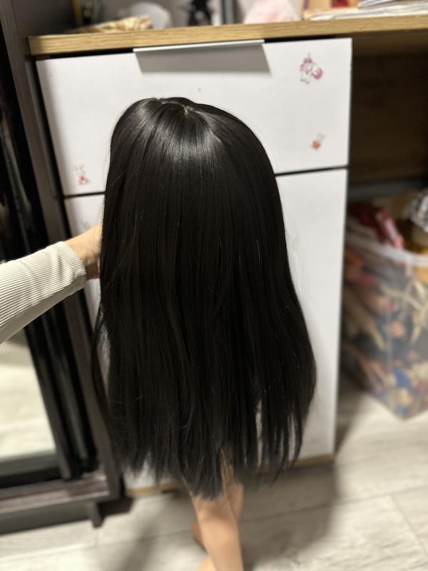 Перука темнокаштанового кольору з імітацією шкіри голови Волосся гарне, має блиск , з чілкою Стан хороший (одягла на куклу щоб видно гарно ) Можу скинути фото на людині