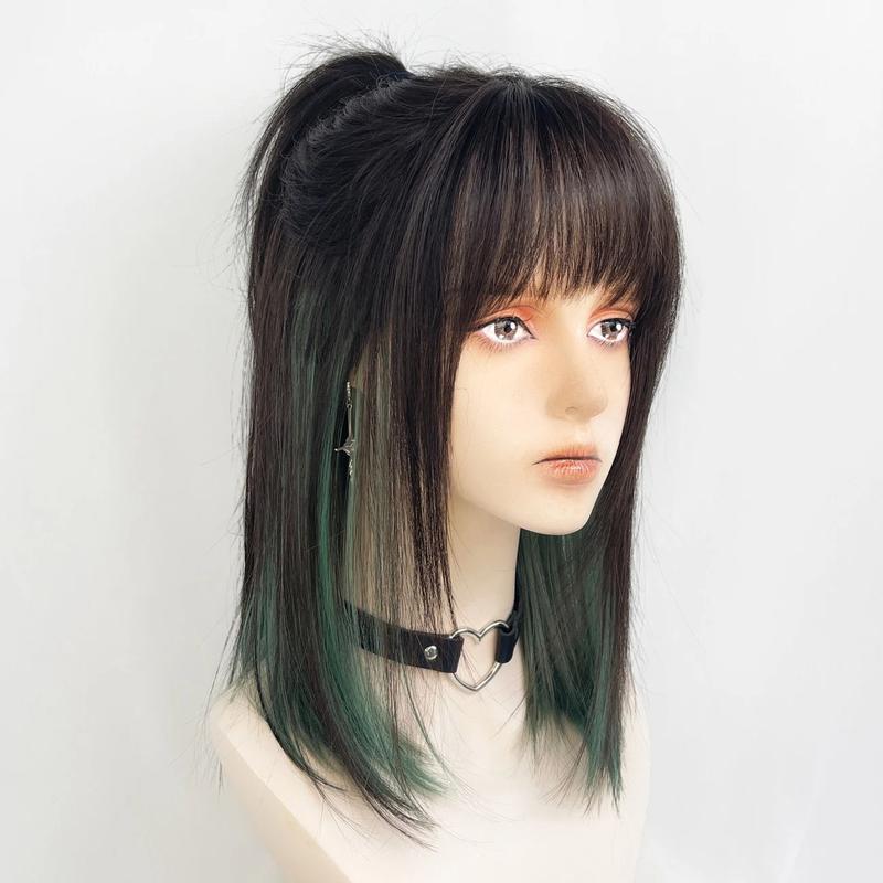 Парик брюнетка с зелёными прядями, стильный косплей парик в японском стиле с "волчьим хвос...