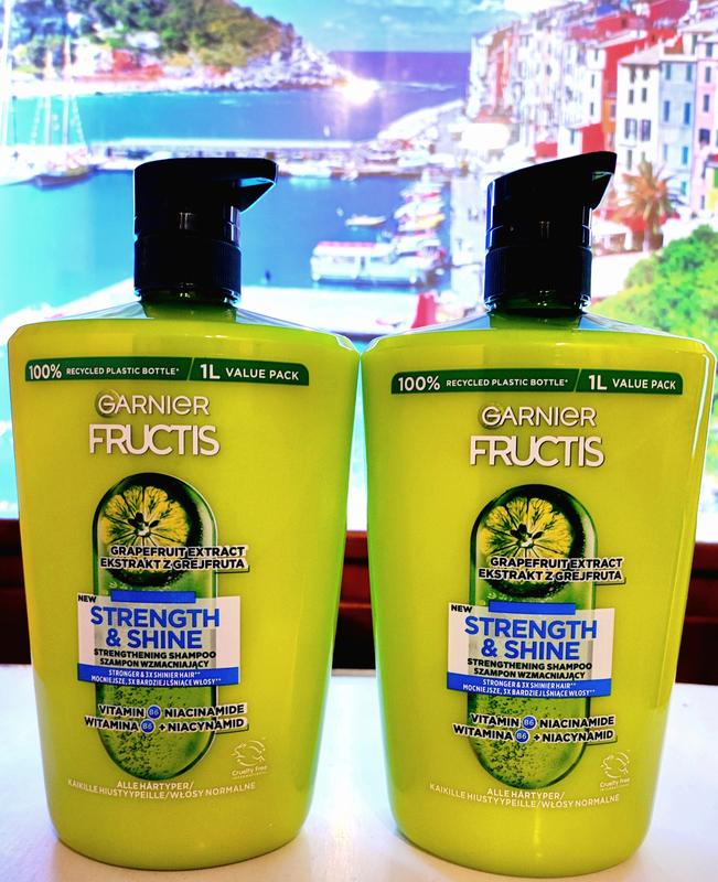Garnier Fructis Strength & Shine – это укрепляющий шампунь для всех типов волос объемом 1 литр. Формула шампуня содержит активные фруктовые масла, витамин В3 и В6, а также масла граната, которые проникают в волосы, укрепляют их от корней до кончиков и делают их более сильным и блестящими.,без силикона