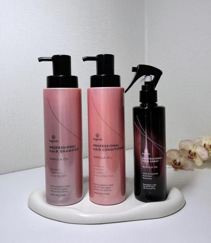 Профессиональный набор для волос с маслом MARULA Шампунь содержит комплекс растительных масел и экстрактов. Масло марулы и арганы возвращают красоту и силу волос, глубоко увлажняют, восстанавливают их структуру, обеспечивают блеск и шелковистость, защищают волосы от воздействия УФ-лучей. Для всех типов волос. Не содержит парабенов. 400 мл Кондиционер облегчает расчесывание непослушных и вьющихся волос, восстанавливает по всей длине и реконструирует секущиеся кончики. Масло марулы увлажняет, придает волосам гладкость и блеск. Олеиновая кислота, антиоксиданты, омега, жирные кислоты защищают, укрепляют и улучшают эластичность волос. 400 мл Термозащитный спрей эффективная защита волос от термического действия. Формула с нано-молекулами белков, восстанавливающих структуру волос. Включает UVA-UVB фильтры. Защита цветов. Без сульфатов. 250 мл