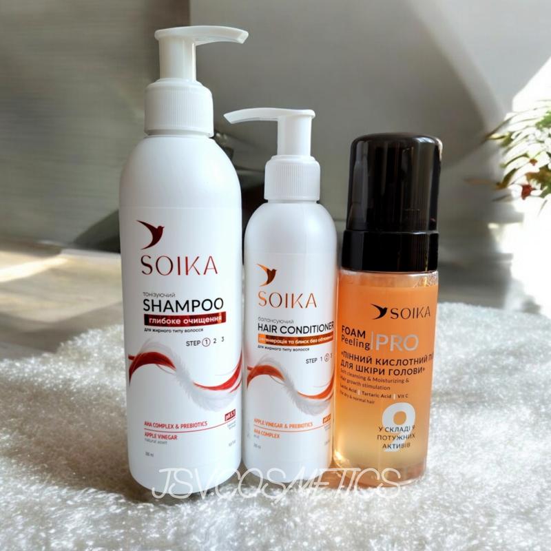 Серія для догляду за жирним типом волосся та сухою (нормальною) шкірою голови "М'яке очищення та зволоження" Soika Набір із трьох засобів: шампунь 300 мл, кондиціонер 200 мл, пілінг пінний для шкіри голови з молочною кислотою "М'яке очищення та зволоження" 150 мл 1. Шампунь для жирного типу волосся "Глибоке очищення" Складові шампуню живлять та підтримують природний мікробіом шкіри, стримують зростання патогенної мікрофлори, зволожують шкіру та попереджують зневоднення. Ці активи передбачають інтегрований підхід до збереження здоров'я та краси волосся й шкіри голови. Комплекс АНА кислот, пребіотики та яблучний оцет дбайливо та глибоко очищує від надлишкового себуму та бруду. Активують механізми захисту та регенерації шкіри, стимулюють вироблення природного колагену та еластину. Активні протигрибкові та антибактеріальні властивості допомагають запобігти появі лупи. 2. Кондиціонер для жирного типу волосся "Регенерація і блиск без обтяження" Комплекс АНА кислот, пребіотики та яблучний оцет відмінно живить, зволожує та зміцнює волосся. Оздоровлює, повертає їм блиск та шовковистість. Кондиціонер надає миттєвий результат ефекту ламінування. Активні речовини засобу глибоко проникають в структуру волосся - це знижує поверхневий опір, робить пасма більш слухняним, запобігає розпушуванню й статичній електризації після розчісування. 3. Молочний кислотний пілінг для сухої та нормальої шкіри голови має пом'якшувальні властивості, які допомагають зменшити лущення шкіри та позбавитися від сухості. Регулює роботу сальних залоз, зменшуючи вироблення себуму і попереджає появу жирного блиску на волоссі.