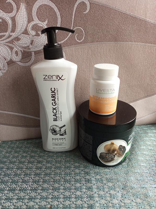 Фото делают само "живые", товар поставляется каждые 10-14 дней Диетическая добавка для кожи, ногтей и волос "Витаминный бьюти-комплекс" LIVESTA, 60 таблеток Маска для волос с маслом черного чеснока Zenix, 500 мл Шампунь с экстрактом черного чеснока Zenix, 400 мл Если вам нужно укрепить корни волос или оздоровить локоны и сделать их чрезвычайно гладкими, то шампунь и маска Zenix с натуральным экстрактом черного чеснока как нельзя лучше подходит для решения этих задач! Кроме своей основной миссии противодействовать выпадению, черный чеснок отлично справляется и с другими важными задачами: тщательно очищает кожу головы от омертвевших клеток, тем самым предотвращая образование перхоти, уменьшает ломкость, избавляет от секущихся кончиков отлично разглаживает и надолго сохраняет шелковистую мягкость прядок. И главное: черный чеснок благотворно влияет на любой тип волос без ограничений! Шампунь и маска не имеет запаха чеснока и не содержит вредных для здоровья веществ.