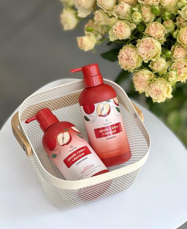 1. Шампунь з екстрактом яблучного оцту допомагає глибоко очистити шкіру голови від забруднень, водночас відновлюючи блиск і життєву силу волосся по всій довжині. Екстракт яблучного оцту відновлює здоровий вигляд волосся і посилює його ріст, зміцнює і пом'якшує, насичує корисними речовинами, легко знімає залишки стайлінгових засобів, усуває ламкість і посічені кінчики. Також яблучний оцет піклується і про здоров'я шкіри голови, зменшує прояв лупи та заспокоює легкий свербіж. (450мл) 2. Кондиціонер з екстрактом яблучного оцту і натуральними поживними оліями: оливковою, мигдальною, аргани і жожоба, а також вітамінами B і E, глибоко зволожує, зміцнює і відновлює ваше волосся, сприяючи його здоровому росту. (450мл)