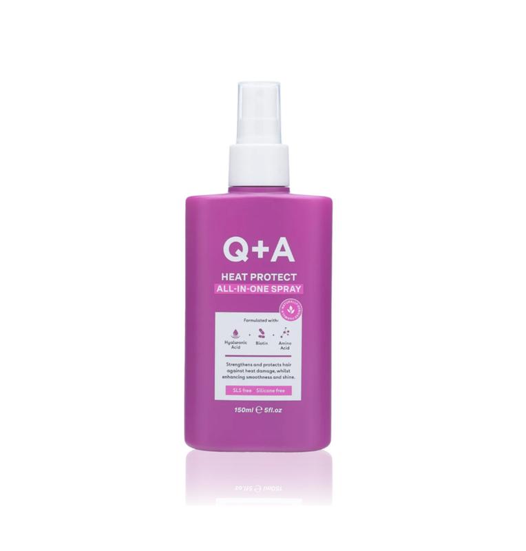 Q+A Heat Protect All-in-One Spray – термозащита для волос: защищает от высоких температур 230°; увлажняет, восстанавливает, делает волосы более послушными; без силиконов; не тестируется на животных; подойдет всем типам волос. Ключевые ингредиенты: аминокислоты – восстанавливают структуру волос изнутри, увлажняют, поддерживают здоровый уровень pH кожи головы; биотин – уменьшает ломкость, улучшает структуру волос, придает им упругость, блеск и объем; гиалуроновая кислота – увлажняет и удерживает влагу. Объем: 150 мл. Способ использования: нанесите спрей на влажные волосы, равномерно распределив по волосам, затем высушите волосами феном.