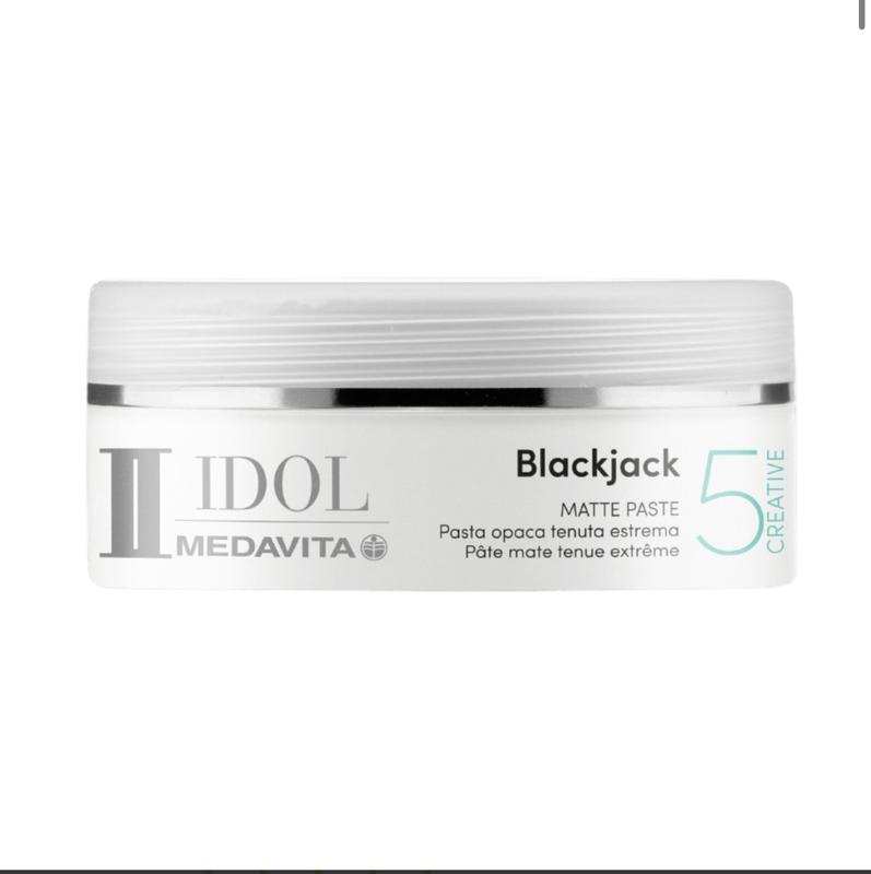 Idol Creative Blackjack Matte paste — матова паста для укладання волосся екстрасильної фіксації. Дає змогу чітко розділити та зафіксувати окремі пасма, надає зачісці структури. Не залишає слідів. Не склеює та не обтяжує волосся, не робить його жирним, натомість залишає його легким та рухливим.