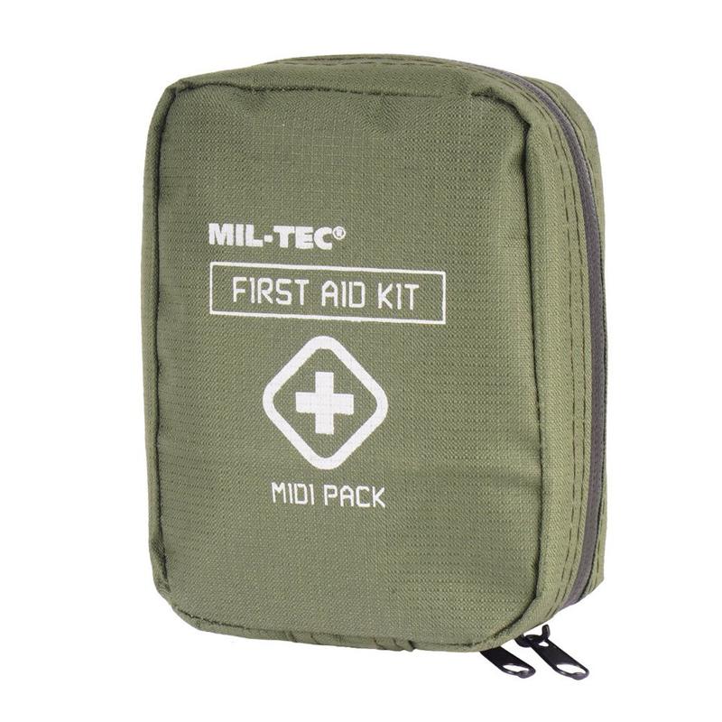 Набор первой помощи MIL-TEC Midi Pack Olive Компактная аптечка, которую можно брать куда угодно. Изготовлена из прочного полиэстера и оснащена крепежной системой, которая позволяет крепить аптечку на рюкзак или снаряжение с системой MOLLE/PALS. Также аптечку можно носить на поясе. Доступные цвета: Red Olive Медицинский подсумок закрывается на двустороннюю молнию. В подсумке есть отделение для удобной организации снаряжения. Аптечка имеет компактный размер, не занимает много места в рюкзаке, и ее удобно брать с собой. В состав MIL-TEC Midi Pack входит: - Elastic Crepe Bandage - эластичный бинт для ран, 4,5м х 7,5см; - Compression Elastic Bandage (PBT) - эластичный бинт (марлевый) 7,5х4,5 см со сплетенным краем. Упакован в прозрачный пакет (2 штуки); - Hand Wash Cleaning Wipe - гигиенические салфетки 5 шт. Каждая помещена в отдельный пакетик; - Wound Pad - стерильная клейкая накладка (пластырь) на рану 5x5 см; - Disponible Gloves - одноразовые виниловые перчатки. Упакован в пакет. Одна пара. Размер: L; - Небольшие ножницы с зелеными пластиковыми ручками; - Английские шпильки разных размеров (6 штук); - Рулонный пластырь (идет в пакете) 4 см х 1 м; - Еще один пластырь в виде ленты длиной 1 м усилен.