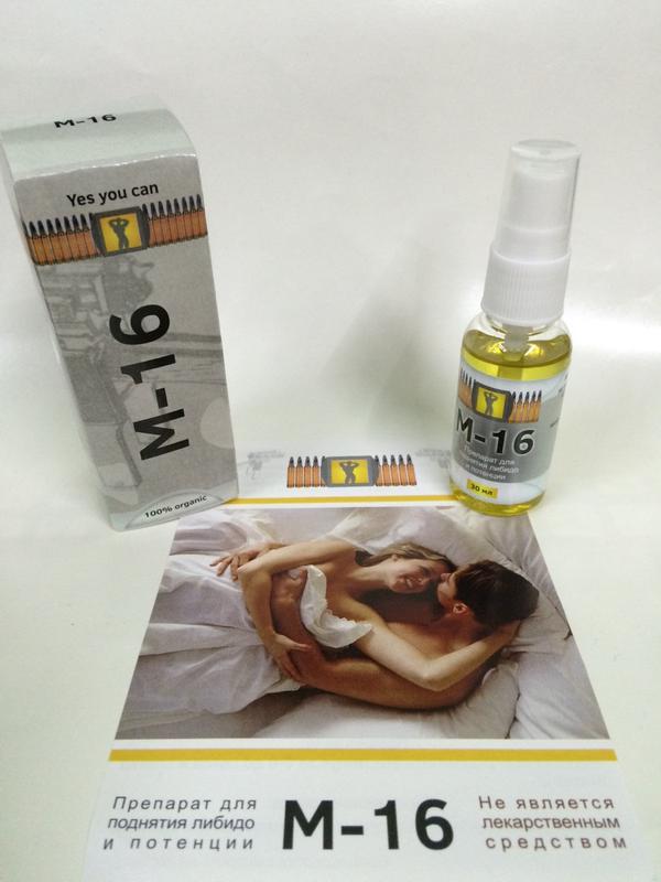 Преимущества - мгновенное действие препарата и моментальный ожидаемый результат; - самая длительная эрекция; - больше оргазмов для вас и для нее; - увеличение полового акта в несколько раз; - совершенная безопасность без побочных действий и противопоказаний (при условии правильного использования спрея). - Он подходит мужчинам от 18 до 80 лет включительно! - Одно нажатие на клапан -- и уже стоит, как у настоящей порнозвезды. Натуральные ингредиенты: - L-аргинин, - гуараны экстракт, - магний, - глицин -- творят чудеса. М-16 прекрасно подходит не только мужчинам, но даже женщинам! - У мужчин: пробуждает мощную эрекцию, усиливает возбуждение в несколько раз, продлевает половой акт, даря просто невероятные ощущения от длительного секса. Кстати, спрей М-16 можно даже незаметно для вашей партнерши распылить перед самым сексом. Ведь флакончик идеально уместится в любой карман. - У женщин: великолепно повышает общую чувствительность влагалища, может обеспечить быстрый, но очень длительный оргазм, и даже мультиоргазм! Способ применения: - необходимо распылить его минут за 5-6 до секса и слегка втереть!