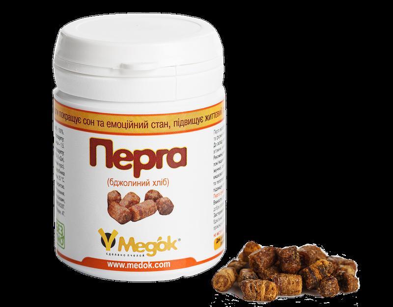 Кілька примірників у наявності Що таке перга? Перга – основний, білковий корм бджіл. Вони виготовляють її з пилку і меду, складаючи їх в осередки стільників. Але перед цим бджоли збагачують мед особливими ферментами. Медово-пилкова суміш лежить в комірках кілька тижнів. За цей час під впливом молочнокислого бродіння пилок поступово перетворюється в «бджолиний хліб» – пергу. Завдяки діяльності молочнокислих бактерій і ферментам, які бджоли додали в мед, шкідлива мікрофлора в перге не розвивається. Таким чином бджоли забезпечують себе кормом на зиму. До осені перга набуває темно-коричневий колір, приємний кислуватий запах і смак. Для людини перга – це дарований природою збалансований комплекс вітамінів і амінокислот. Він ідеально підходить більшості людей і засвоюється організмом на 100%. У складі перги виявлені білки, вуглеводи, вітаміни, 16 амінокислот, 13 жирних амінокислот, серед яких незамінні. А за складом вітамінів вона може змагатися з самими дорогими і якісними вітамінними комплексами, які продаються в аптеці. У складі перги вітаміни А, В1 і В2, В6, D, С, Е, Р, а також калій, кальцій, магній, залізо, цинк, натрій і інші мінеральні речовини. Рекомендації по застосуванню перги Як комплекс вітамінів, мінералів і амінокислот, перга рекомендується до застосування при зниженому імунітеті, авітамінозі і високої стомлюваності. Вона підвищує імунітет і допомагає організму самостійно боротися з вірусами та інфекціями. Діти, які беруть пергу протягом декількох місяців, рідше хворіють на ГРВІ та грип, що дає їм можливість не пропускати заняття в школі і дитячому саду. Хороші результати спостерігаються при комплексному прийомі перги та маточного молочка. Рекомендується вживати пергу для профілактики і лікування захворювань печінки. Перга – прекрасний гепатопротектор. Вона чистить печінку, відновлює роботу її клітин, відновлює і покращує їх ферментативну активність. Також перга виводить з організму холестерин, токсини і шлаки, знімаючи тим самим додаткове навантаження з печінки. Використовують її при лікуванні холециститу, гепатиту, жирової дистрофії печінки, цирозу як доповнення до основного лікування. Також в комплексі з основним лікуванням перга застосовується при захворюваннях статевої сфери: чоловічому і жіночому безплідді, простатиті та аденомі простати, порушення гормонального балансу, статевої дисфункції. Для лікування цих захворювань пергу краще приймати разом з маточним молочком або трутневим гомогенатом. Використовують пергу і при лікуванні захворювань травної системи: проблем у роботі ШКТ, зайвої ваги, ожиріння, виразки шлунка та 12-палої кишки, а також при порушеннях обміну речовин. Перга застосовується для профілактики і лікування захворювань серцево-судинної і кровоносної системи, гіпертонії, аритмії, інсультів і інфарктів. Жінкам рекомендується приймати пергу під час вагітності та у післяпологовий період. Вона допомагає швидше відновитися після пологів, збільшує лактацію. Дітям у невеликих дозах можна давати пергу з двох років, попередньо переконавшись у відсутності алергічної реакції. Перед цим потрібно обов'язково порадитися з лікарем. Пергу потрібно приймати дітям і дорослим при зниженому рівні гемоглобіну і еритроцитів, а також при відсутності апетиту, анорексії. Спортсмени і люди, ведучі активний с
